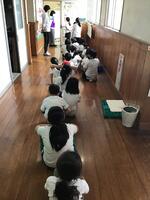 今日は、今年度の新しい清掃班での清掃開始です。初めてなので、打ち合わせをしていますね。丁寧に床を掃いたり拭いたり、真剣に取り組みました。