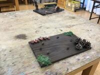 まずベースとなる杉板をバーナーで焼いて杉板焼きを作りました。そして板に飾り付けをして完成です。