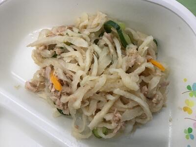 献立は、「サラダうどん、牛乳、ミニ丸パン、ハムカツ or 白身魚フライ」でした。