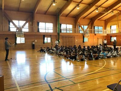 今日は業間の時間に全校集会を実施しました。
