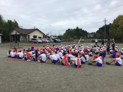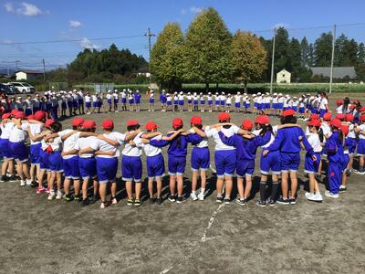 児童全員に職員も加わり、運動会の成功を祈って円陣を組みました。