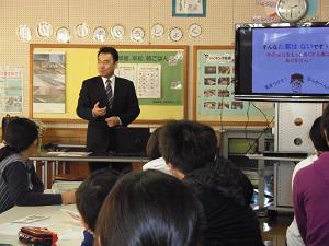 12月8日(木)にJR宇都宮駅の駅長さんをはじめ3名と1匹(?)の方においで頂き、踏切の安全な渡り方についてのお話をいただきました。本校の学区内には4箇所の踏切があり、子どもたちは毎日の登下校で横断しています。1昨年から始まった取組で、今までは体育館で全学年を対象に行っていましたが、今年は1年生を対象にお話をして頂きました。駅長さんのお話もさることながら、PP〇Pのような動きをするかわいらしいお猿さんに子どもたちの目は釘付けでした。今日のお話を生かしてこれからも事故のないように安全に横断してほしいと思います。貴重なお話とすてきなプレゼントをありがとうございました。