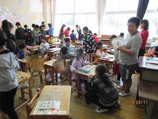 入学式の翌日から、6年生は交代で1年教室に出かけ、名札の付け方やロッカーの使い方を指導してくれました。