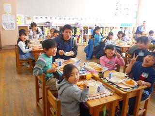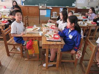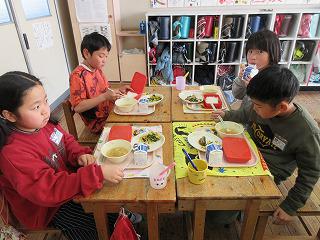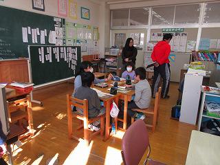 「ごはん、牛乳、厚焼き卵、おかかあえ、すき焼き風煮」です。今日は、4年1組に宇都宮大学教職員大学院の方が1名いらっしゃっています。休み時間に一緒に縄跳びをしたり、授業で支援していただいたりしました。