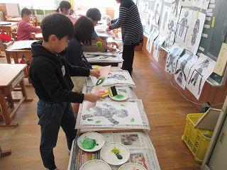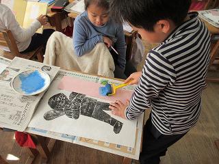 3学期の図工は、どの学年も刷りに入っています。5年生になると、彫りと刷りを交互に行いながら、色を重ね、新しく彫った箇所の色との調和を考えて作業を進めていました。