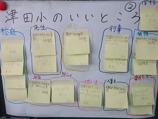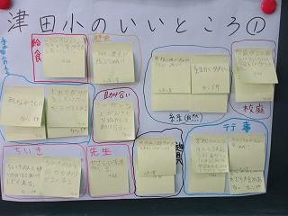 授業は終わってしまっていたのですが、黒板に子どもたちが話し合った記録が残されていたので、思わずパチリ。一人一人が津田小のよいところを付箋紙に書き、グループの中で仲間分けをしました。これから、学校のためにできることを考えていくそうです。