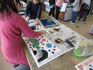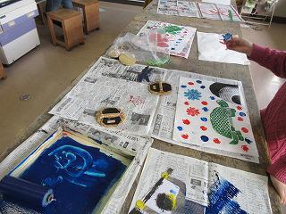 3年生も、図工室で刷りの最終段階です。作った型に思い思いに好きな色をローラーで付けて、楽しそうに用紙にペタペタしていました。