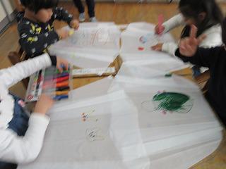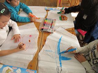 子どもたちが、タコに好きな絵を描いたり文字を書いたりしていました。飛ばす日が楽しみですね。