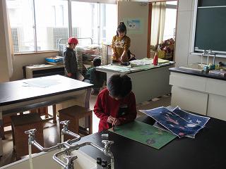彫りと刷りが終わった子どもたちは、裏面から白い部分に彩色しています。表面から見ると黒い部分との色の違いで、白黒の版画とは違った感じになります。