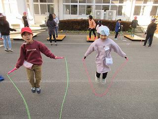 2年生になると、縄を回す役目は、子どもたちです。腕を伸ばして大きく回しているのが印象的でした。1回目より2回目、調子が出てきてスピードが出てきて子どもたちも楽しそうに跳んでいました。そして、目標の100回を超えることができました。おめでとう。