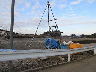 暖冬と言われる今年の冬ですが、時々冷え込む日があります。今朝、体育館の屋根は真っ白で、新校庭の水たまりに氷が張りました。松原からの通学路に、ボーリング調査でしょうか写真のような機材が設置されていました。子どもたちには、近づかないよう指導しました。