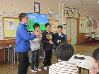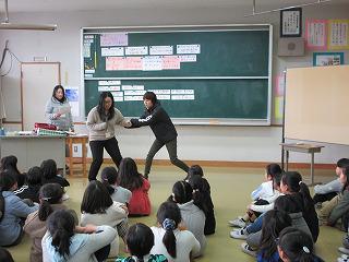 国際理解教育VTの方にお世話になり、「能と狂言」について話をしてくださる講師の方をお招きしました。授業の中でも扱っているので、子どもたちも興味津々。使われる道具も見せていただき、子どもたちの反応は最高潮に。