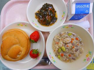 枝豆のポタージュはとてもなめらかでした。クロケットとはフランスのコロッケのことですが、子どもたちはいつものコロッケのようにパンに挟んで食べようとして、「先生、ジャムはどうやって食べるんですか」と質問していました。今日はジャムをつけてパンを食べてね。