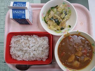 「麦ごはん、牛乳、ポークカレー、こんにゃくサラダ」です。麦ごはんは、栃木県産の大麦です。いつもの麦ごはんに比べて色合いが違いますが、噛んでみると適度な硬さと甘みで、カレーをかけるとさらにおいしくなりました。