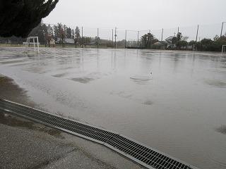 早朝にかけての強い風雨のため、車で送ってこられる子どもたちが多くいました。松原方面から徒歩で通過する子どもたちは30人ほどでした。6年生が丸太が流れていたと話していた武子川は、黒い水が上流から流れていて、水位もいつもより50㎝は上昇していました。新校庭もほとんど地面が見えません。