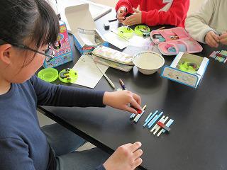 N極とS極、磁石の2つの極の関係を実験を通して調べる授業です。同じ極同士、異なる極同士を近づけたときどうななるか、棒磁石やU型磁石を使って、そして水に浮かべたりストローの上にのせたりしながら実験を進め、カードに記入していました。