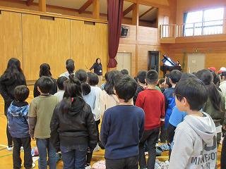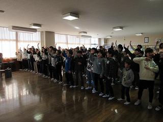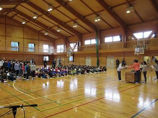 先日児童会が主催したなわとび集会の表彰状の授与が行われました。代表委員会の児童から、各学級の代表児童が受け取りました。その後、卒業式に向けた歌の練習を全員で行いました。指導の先生から、大きくて元気な声が出ているとお褒めの言葉をいただきました。