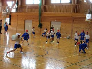 体育館で、やわらかボールを使ってドッジボールを行っていました。なかなかよいファームで投げていますね。