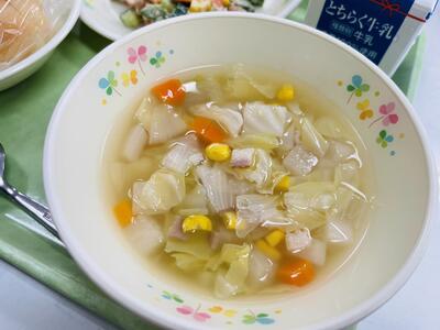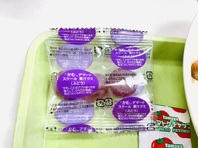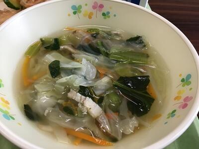 また、七夕汁に入っている白いうどんの様な麺は、魚のすり身でできている魚麺(うおめん)です。七夕の行事食といえば「素麺」ですが素麺は食缶の中で伸びてしまうので、魚麺で代用しました。つるんとした食感が食べやすく、子供たちにも好評だった様です。