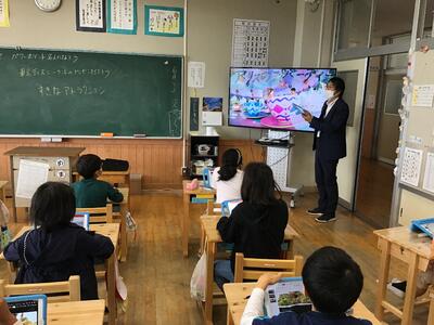 全国一斉盲導犬教室に4年生が参加しました。視覚障害や盲導犬について理解を深めるための事業で、ZOOMを使ってオンライン配信されます。