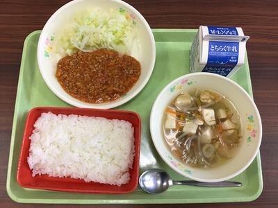 こちらは、「まんてんみそしる(満点味噌汁)」です。何といっても具材が豊富。「だいこん、にんじん、ごぼう、しめじ、あぶらあげ、わかめ、ほうれんそう」ですね。栄養満点で満点汁です。ちなみに今回のだいこんは、津田地区で生産されたもので、今朝届きましたので地産地消、産地直送の一品です。お味のほうは、みそ味控え目、だしがしっかり、という感じでもちろん満点です。