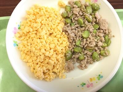 まずは三食丼です。この卵そぼろ!実は、調理員さんの手作りです。(これって本校だけではないでしょうか。通常は「業務用卵そぼろ」が多いようです。)これは、卵だけきちんと味わう必要がありそうです。