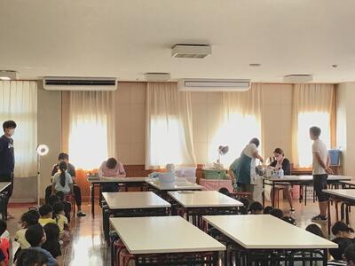 学校歯科医の先生方が来てくださいました。静かに待って、きちんと検査を受けています。(写真は、1、2年生です。)