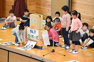 休憩をはさんで、2年生が登場しました。国語「カンジーはかせの大はつめい」でかん字合体ロボの参上、「みんみん」「おおきくなあれ」「赤とんぼ」でもカードを使って、楽しい発表でした。音楽は「はしのうえで」「イルカはざんぶらこ」「かえるのがっしょう」「山のポルカ」の発表でした。