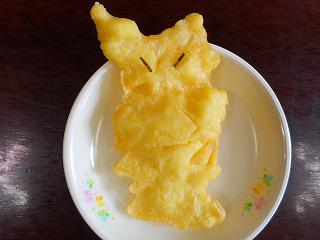 給食と読み聞かせをコラボさせたお話給食です。献立「ごはん、牛乳、イカ天ぷら、和風あえ、みそ汁」のイカ天が入った各クラスのバットに、写真のおばけ天ぷらが入っています。そこで、子どもたちに問題!「さあ、この中に何が入っているでしょう?」答えは、昼休みの図書室へという具合です。読書に親しむことと楽しい給食のために、給食室と図書支援員の先生が協力して進めました。調理員さんも、お化け作りを楽しんでいたそうです。昼休みの図書室に子どもたちが集まり、絵本「おばけのてんぷら」の読み聞かせに耳を傾けていました。絵本の答えは「おばけ」でしたとさ。