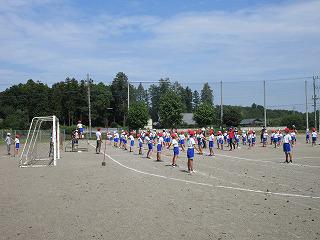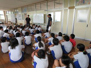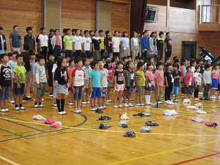 業間時体育館で開かれた全校集会は、まず夏休み等の活動の表彰でした。特に、スポーツ少年団の活動で、8月10日に開かれた水泳交流大会での成績がとてもよく、リレーをはじめたくさんの種目で優勝や入賞がありました。