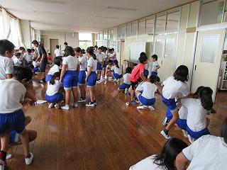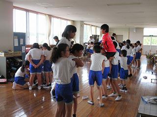 体育館で、体ほぐしの運動を行っていました。担任が自作したサイコロ(各面にはワニやうさぎ、イモムシ等の動物の絵)を使って、出た面の動物や虫の動きをまねる授業です。いきなりワニが出て、アザラシをイメージする子どもたちが多かったのですが、数人の子どもたちが手と足を上手に使い、体を低くして歩いていたので、みんなから拍手喝采をあびていました。