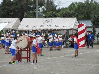 開・閉開式の練習が始まりました。国旗、優勝旗や準優勝杯、各学年のプラカードなど係の子どもたちが、先生の指導の下それぞれの動きやタイミングを確認しながら、練習しています。