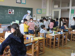今日の献立は、バターロール、牛乳、オムレツ、アスパラガスのサラダ、そしてチリコンカンです。子どもたちに合わせて、辛さを押さえてあります。今日は、3年1組に学生ボランティアの先生が来てくださっていたので、会食の様子をパチリ。