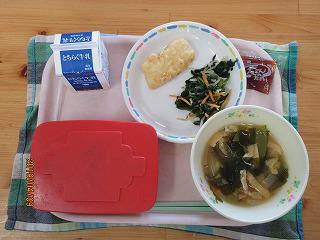 今日のリクエストは6年生。「わかめごはん、牛乳、からあげ、即席漬け、春雨スープ、レモンゼリー」です。中でもわかめごはんは、塩加減がちょうどいいと子どもたちに好評です。さすが6年生。食管の中も、あっという間に空っぽになってしまいました。