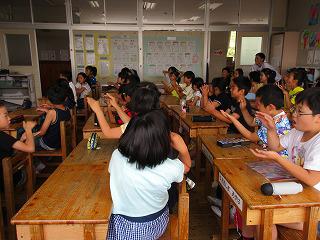 来週で1学期も終わります。そこで、6年1組と1年1組の教室をのぞいてみました。6年生は学級会で、9月にある運動会のスローガンを考えていました。子どもたちの中には、ことわざ字典なるものを開いて、意味やこれまでのスローガンとの重複を考えながら話し合っていました。1年生は、音楽の授業でした。リズム打ちの学習で、「じゃんけんぽん」を歌いながら、先生を相手に勝った負けたと声を上げながら興じていました。