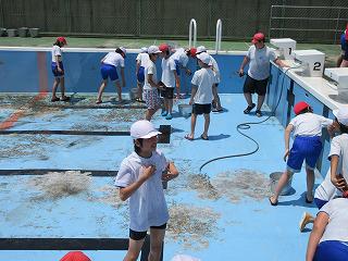 先日の5・6年生に続いて、今日は1・2年生のプール利用日です。背の小さい子どもたちも怖がることのないように、予め水位を下げておきました。水温も高かったためか、気分の悪くなる子も出ませんでした。先生の指導の下、水をかけ合ったりおへそがでる位にジャンプしたりして徐々に体を水に慣らしていき、楽しそうな表情を見せていました。