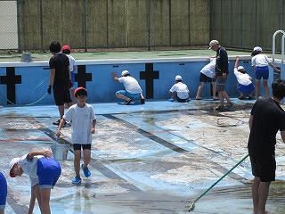 遊びは、三本線、ケイドロ、ヘビ鬼、ドッジボール、ドッジビー(ボールの代わりにフリスビー)。こういうときの一番人気は、ケイドロ。体育館の玄関やプールの入口を牢屋に見立てた鬼ごっこです。遊ぶのに何の道具もいらない。これが一番ですね。子どもたちは、これまでにも清掃で顔を合わせているので、1学期はじめのときよりもしっくりいっているようで、微笑ましく見守ることができています。