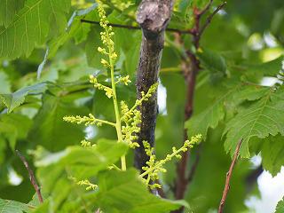 モクゲンジが花を咲かせ始めました。満開になると「ゴールドレインツリー」の名の通り、金色の雨だれのようになります。