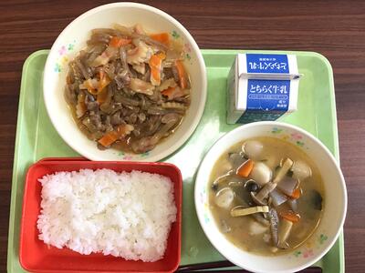 給食週間2日目です。今日の献立は、「ご飯、牛乳、鶏肉の七味焼き、ごまあえ、粕汁」です。まずは映像を!