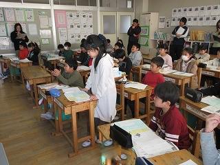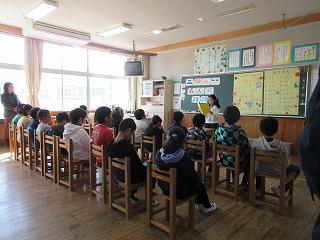 「ようすをあらわすことば」の単元で、2年生の研究授業がありました。写真や絵を見て、様子を表す言葉(擬態語・形容詞・比喩)をワークシートに書き込み、友達のワークシートを見合ったり、先生と一緒に確認したりしました。そして、今日の学習を振り返った後、参観した先生と一緒にビンゴゲームをやりながら、言葉と絵を組み合わせていろいろな様子を表す言葉を学習しました。