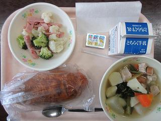 「キャラメル揚げパン、牛乳、花野菜サラダ、ポトフ、チーズ」です。子どもたちの注目の的は、何と言ってもキャラメル揚げパン。4年2組で人気のココア揚げパンとどちらが好みか聞いたところ、やはりココア揚げパンに軍配が上がりました。