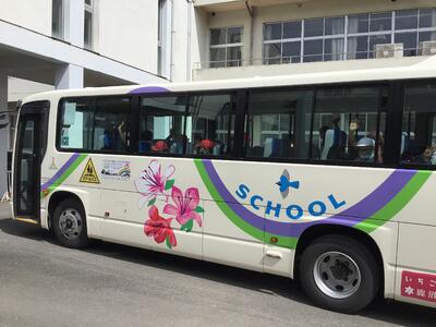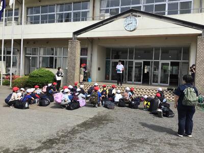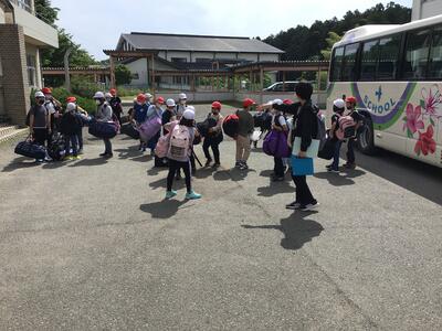 よい天気です。自然生活体験学習日和です。出発式をしっかりと行い、4年生たち、元気に出発しました。