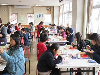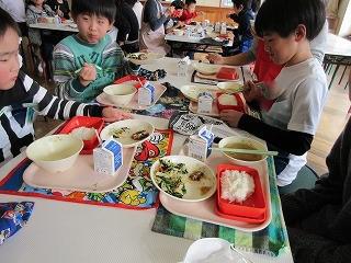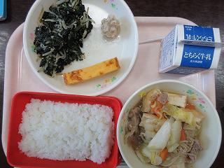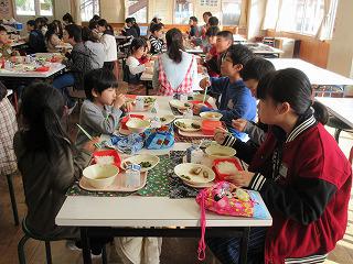「ごはん、牛乳、サンマのみぞれ煮、おひたし、いなか汁」です。昨日と今日は、1・6年生の交流給食でした。