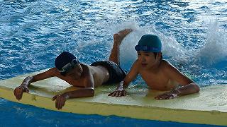 今日の午後はプールに入りました。水温29℃、室温26℃、泳ぎ回るにはちょうどいい温度でした。追いかけっこやリレーなど、係の考えたゲームをみんなで楽しみました。