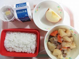 「ごはん、牛乳、納豆、肉じゃが、リンゴ」です。昨日に続いて、3・4年生の交流給食でした。
