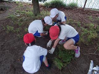 5月31日(水)、業間の時間に除草作業が行われました。ピアサポート活動の1つでもあります。6年生は1年生に、5年生は2年生に、4年生は3年生に、仕事のやり方を丁寧に教えながら、協力して取り組んでいました。暑い中での作業でしたが、一生懸命に取り組む姿が印象的でした。つだっ子は、本当に働き者だと思います。