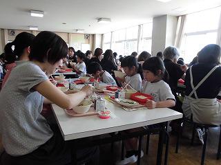 5月30日(火) 体育館・食堂で1学年PTAがありました。親子エアロビ、給食試食会が実施されました。親子でさわやかな汗を流した後、村上栄養教諭から食についてお話を聞いて、おいしい給食になりました。体を思いっきり動かした後の給食は格別です。メニューはサケのスタミナ焼き、コロコロづけ、けんちん汁、アセロラゼリーです。1年生の体のすみずみまで栄養が行き渡りました。