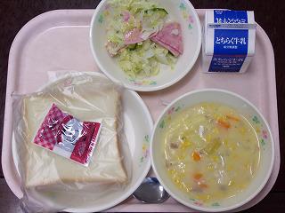 今日の給食の献立は、ミルクパン、牛乳、野菜シチュー、ヨーグルト、ミニフィッシュです。今日は〈防災給食〉ということで、温めずそのまま食することができる野菜シチューが出ています。
