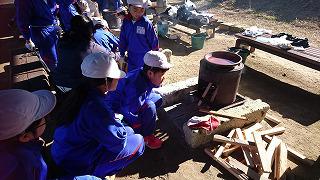 午前中の活動は塩作り・つぼ焼き芋作りです。海岸で汲んだ海水を直火で煮詰めて塩を作ります。1リットルの海水からとれる塩は約3グラム。薪に火が点かずに苦労した班もありましたが、大部分の水が蒸発して水が白く濁ってくると、あとはあっという間に塩がわき出るように出来てきます。さつまいもも美味しく焼き上がりました。