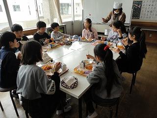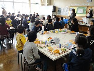 6年生を送る会の後、給食は縦割り班の給食です。6年生との会食も最後ですね。この1年本当にお世話になりました。1年生は入学直後は名札の付け方やカバンのしまい方等たくさん教えてもらいました。また、5年生は立派な先輩としてお手本としてがんばっていこうとする決意を固めていました。